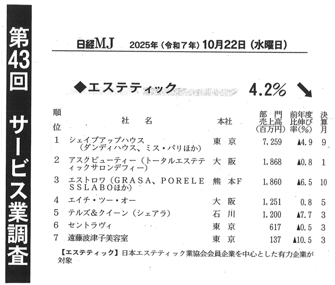 2025年10月22日(水)日経MJ新聞に日本エステティック業協会(AEA)の会員を対象とした、有力企業の売上高ランキングが掲載されました。